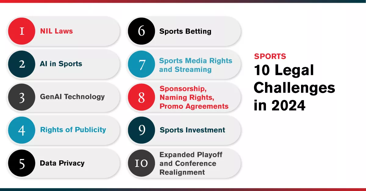 Some of the traditional aspects of the sports industry, such as sponsorships and financings, are creating new challenges and opportunities. The sports landscape is ever-changing, and we expect opportunities to continue to present themselves as we see sports betting expand and team ownership now attracting private equity and sovereign wealth funds as major investors. With these new areas of focus and opportunities come significant legal challenges that have the potential to upend the industry. With 2024 underway, we highlight 10 of the most pressing legal issues facing the sports industry this year, but given the wide range, we could have highlighted 20 or more issues.