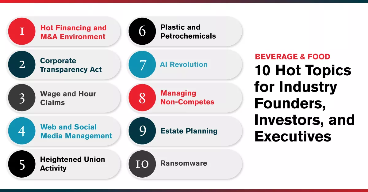 Here are 10 hot topics that founders, investors, and executives leading beverage and food companies should monitor as the year develops.