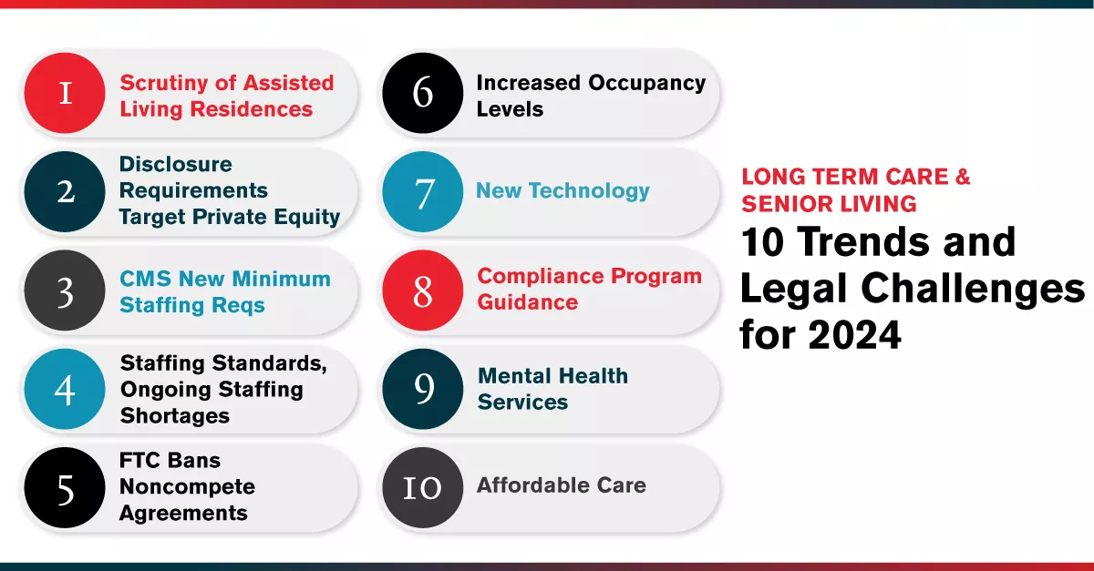 With 2024 well underway, this article highlights some of the pressing legal issues impacting the long term care and senior housing industry this year, including trends affecting the industry and emerging issues industry participants likely will face throughout the rest of 2024 and beyond.