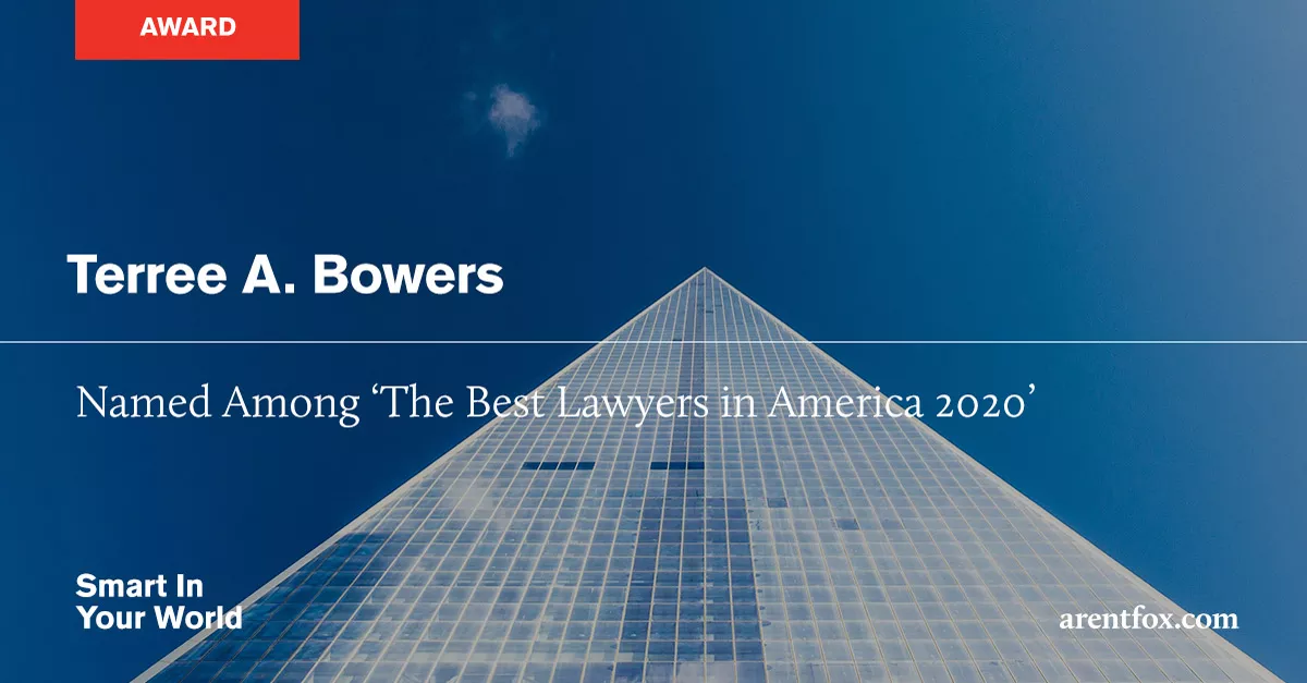 LOS ANGELES – Arent Fox LLP is pleased to announce that Terree Bowers was among the 50 Arent Fox attorneys who have been rated as leaders in their profession by The Best Lawyers in America 2020. The nation’s oldest peer-review directory for lawyers selected the Arent Fox attorneys from legal disciplines that span the firm’s litigation, regulatory, and transactional capabilities.
