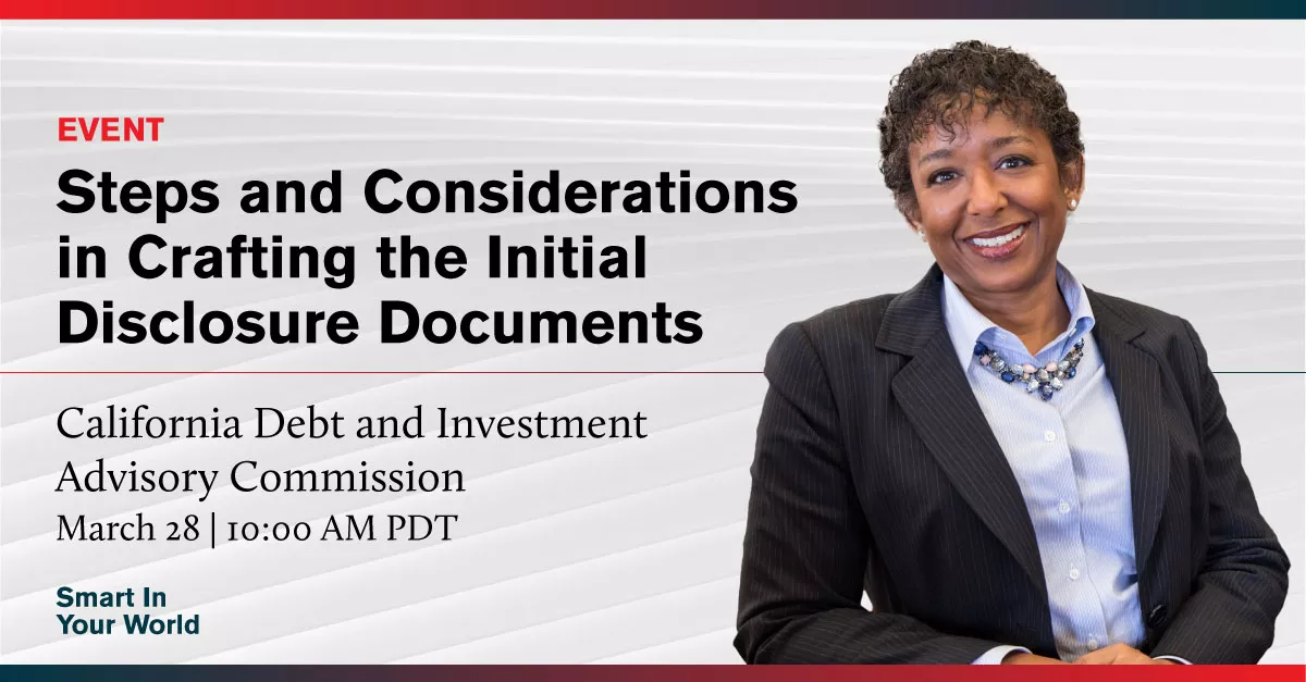 Jacquelynne Jennings will speak at the California Debt and Investment Advisory Commission’s Municipal Market Disclosure Fundamentals and Evolving Practices Conference on March 28, 2023.