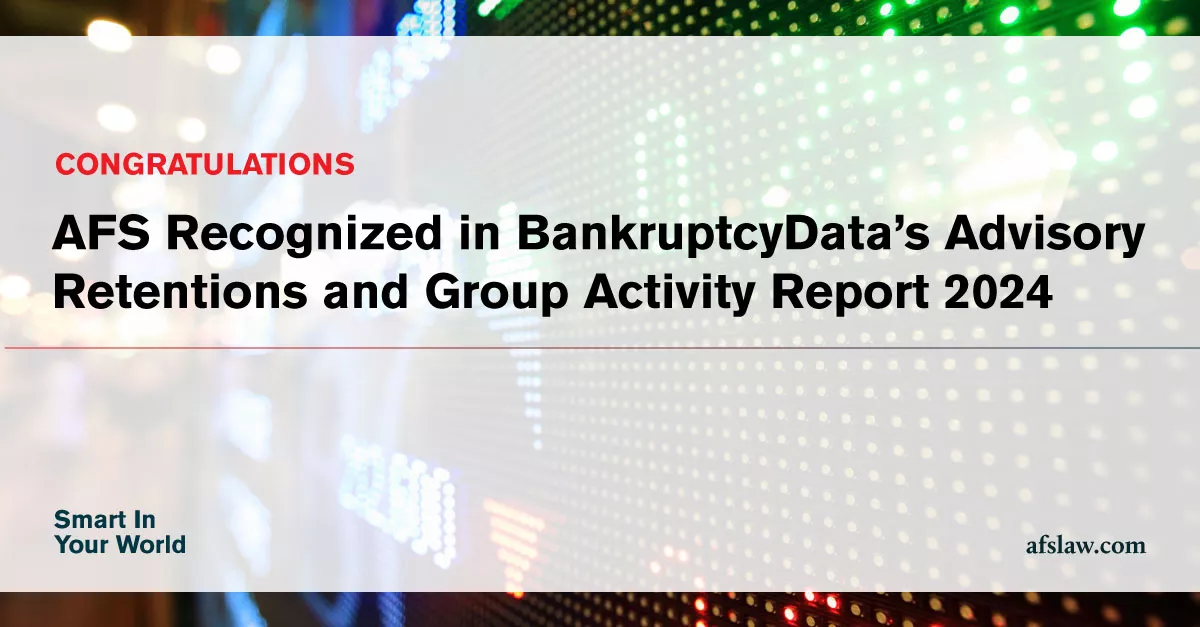 ArentFox Schiff is pleased to announce that the firm and three attorneys have been recognized in BankruptcyData’s Advisory Retentions and Group Activity Report for the first half of 2024.